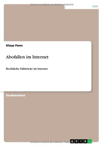 Studienarbeit aus dem Jahr 2011 im Fachbereich Jura - Medienrecht, Multimediarecht, Urheberrecht, Note: 1,3, FernUniversität Hagen, Sprache: Deutsch, Abstract: In den letzten ca. 5 Jahren hat sich im Internet die Erscheinung der „Abofallen", „Kostenfallen" oder „Vertragsfallen" zu einem Massenphänomen entwickelt. Laut einer Informationsseite im Internet sollen 161 Anbieter 1362 verschiedene Abofallen betreiben.1 Dabei wird stets nach einem ähnlichen Muster vorgegangen. Internetbesucher werden bei der Suchmaschinen- recherche auf vermeintliche Gratisangebote der Abofallenbetreiber gelock (...) Auf die in Wahrheit existierende Kostenpflichtigkeit wird regelmäßig nur an versteckter Stelle hingewiesen (...) So ist wohl auch der ehemalige Hamburger Bürgermeister Ole von Beust auf der Suche nach einem Kochrezept schon einmal in eine solche Falle geraten. (...)